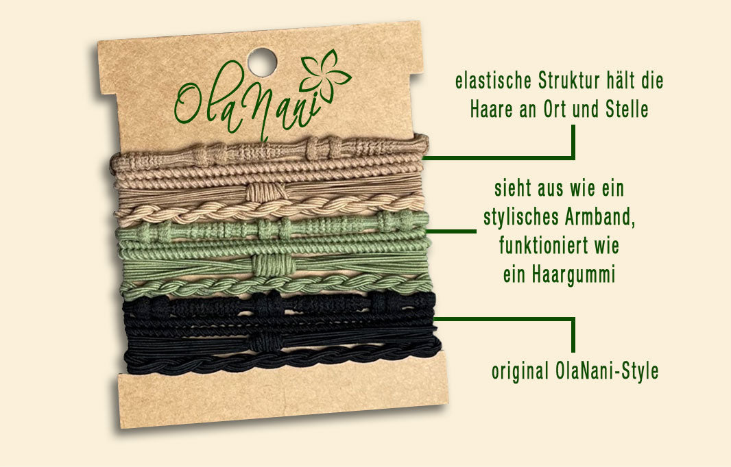 Meine Tochter und ich haben langes und dickes Haar. Wir haben viel ausprobiert und sind bei euch geblieben. Die Haargummis leiern nicht aus. Auch wenn meine Tochter zum Ballett sich ein Dutt macht, die OlaNani Haargummis halten durch. Das beste ist, sie sind nie weg. Andere Haargummis waren ständig verschwunden, eure sind immer da. Es gibt nichts besseres